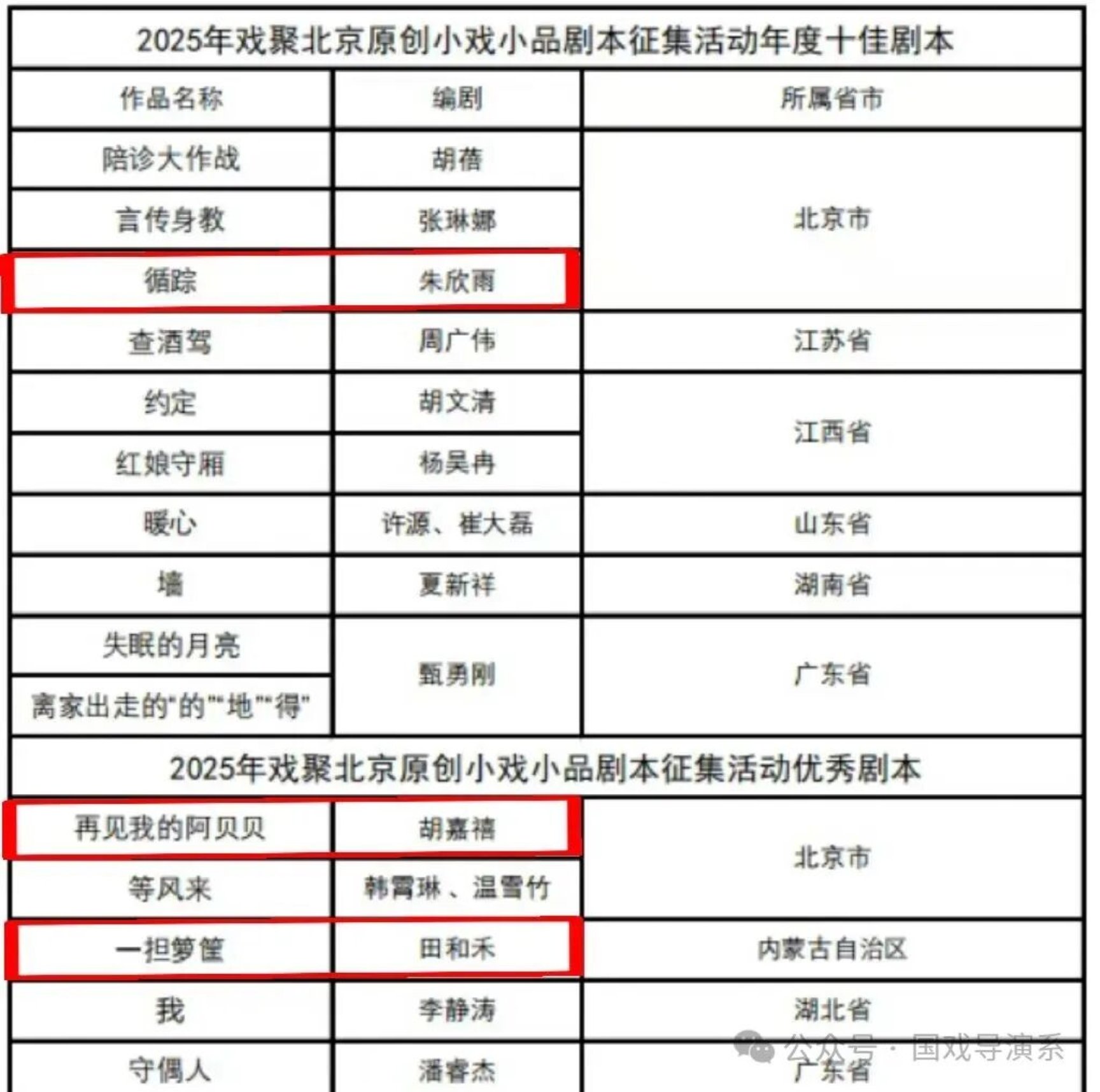 近日,“戏聚北京”原创小戏小品剧本评选结果揭晓,中国戏曲学院导演系学子凭借扎实的专业功底与鲜活的创作表达斩获佳绩——2024级戏曲导演专业研究生朱欣雨、2025级戏曲导演专业研究生田和禾、2023级戏曲导演专业本科生胡嘉禧,分别凭借个人作品荣获年度“十佳剧本”“优秀剧本奖”,以青春力量为导演系再添光彩