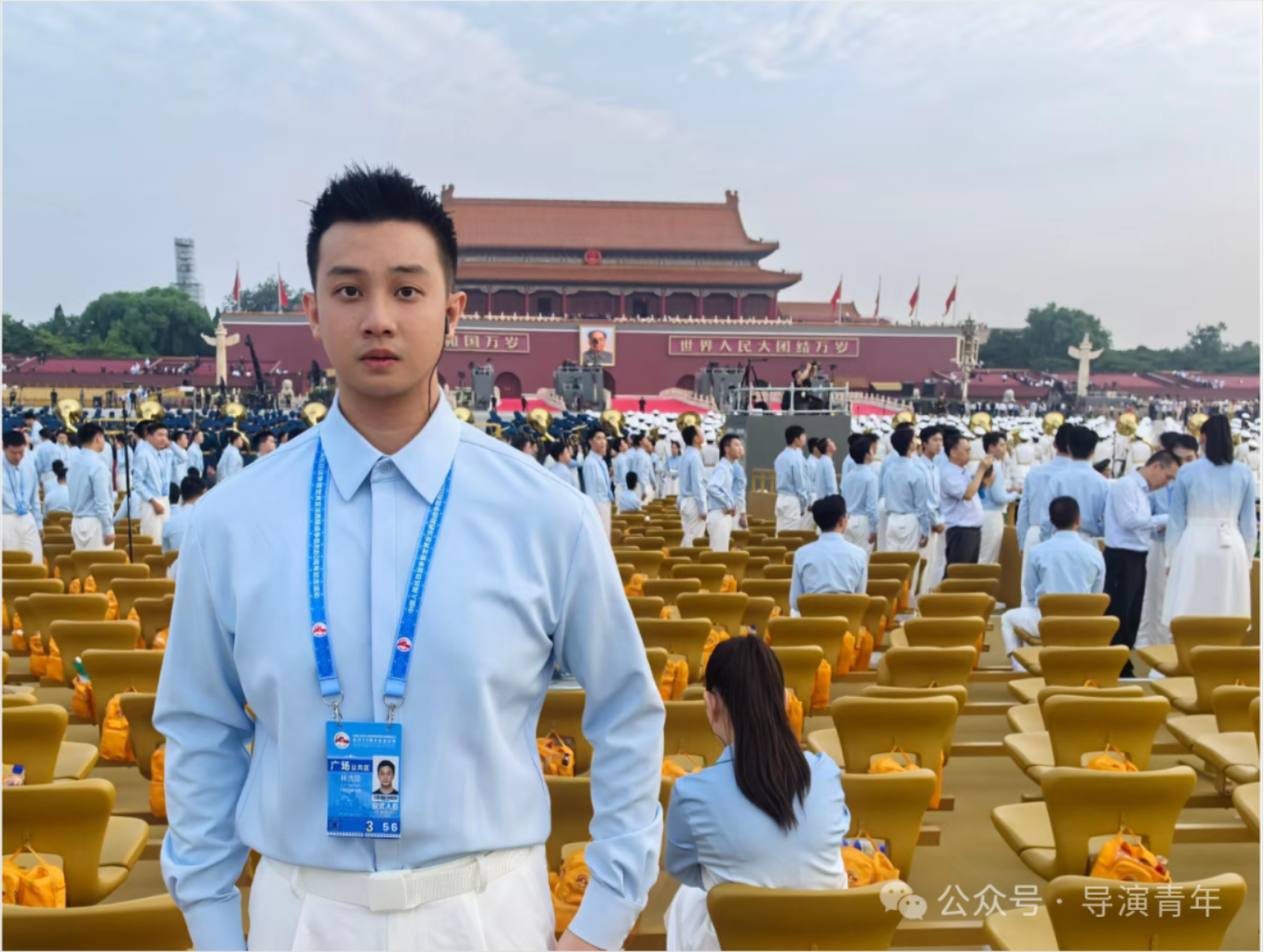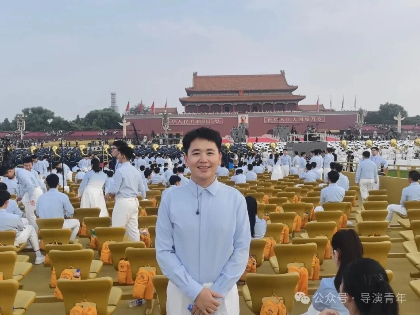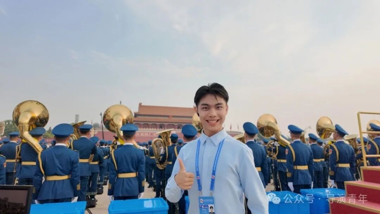 七月,我们前往联合军乐团合练,踏入军营那一刻,庄严神圣的气息扑面而来。排练时总指挥强调“表情好才能上镜头”,我原本被安排在十几排,前面人墙严密,几乎看不到前方,但我心中有一股不服输的劲,拼命踮起脚、昂起头,目光紧紧追随着分指挥。终于,导演注意到了我——他说,是我那被汗水浸湿的额头,和眼中炽热的光,让我在人群中格外醒目,他把我调到了第一排。